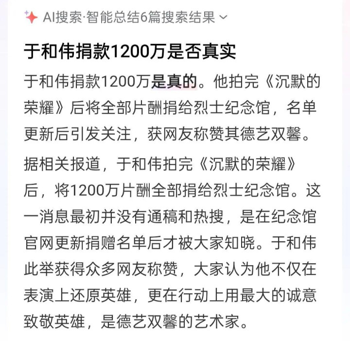 记者注意到,近期,上述消息在多个社交平台广为流传,均提到《沉默的荣耀》主演于和伟将1200万元片酬全部捐给烈士纪念馆,其中多人明确提到是吴石烈士纪念馆,甚至多个社交平台AI搜索结果也提及有此事,引发热议,不少网民纷纷留言点赞。